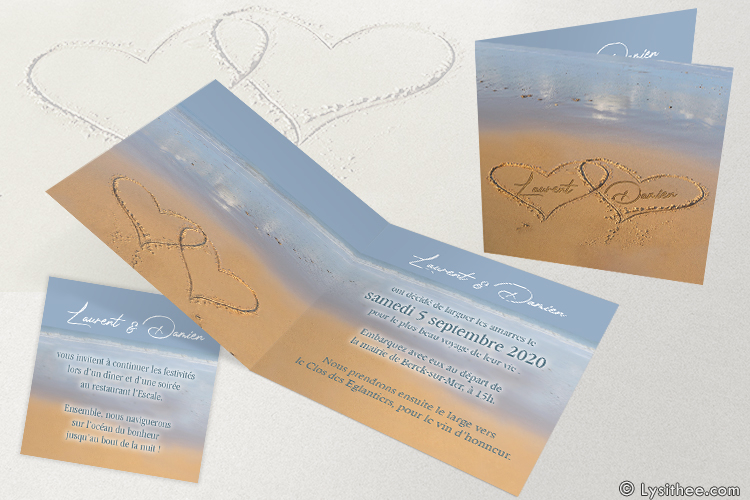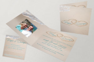 Faire-part de mariage, 2 volets et carton d’invitation au dîner