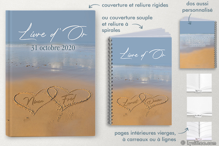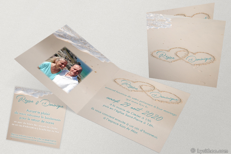 Comme toutes les collections présentées sur ce site, celle-ci peut se décliner pour correspondre parfaitement à votre mariage. Par exemple, cette version avec des teintes plus turquoises et une photo des fiancés (cliquez pour voir en grand).